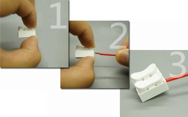 З'єднувальна підпружинена подвійна клема 250 V 10 А використовується для з'єднання електричних дротів. Обладнана самозатискними контактами. Клему зручне у використанні, неабияк прискорює монтаж. З'єднувач дає змогу під'єднати дроти без паяння, без спеціального інструменту. Застосовується для електричного обладнання, освітлення, побутової техніки та ін.